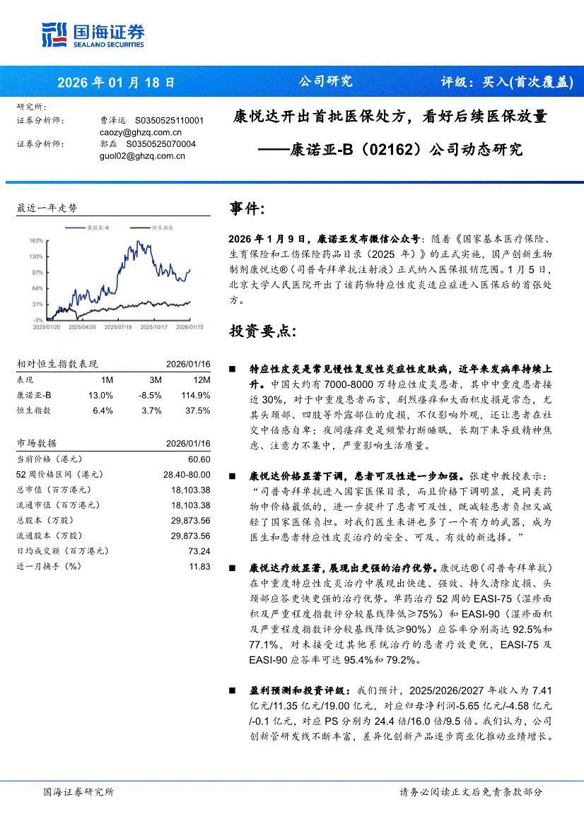 康诺亚~B:国海证券-康诺亚~B-2162.HK-公司动态研究:康悦达开出首批医保处方,看好后续医保放量-260118