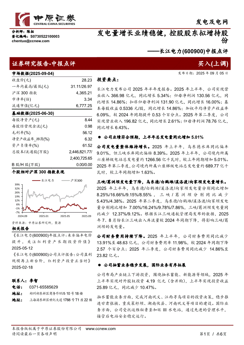 长江电力:中原证券-长江电力-600900-中报点评:发电量增长业绩稳健,控股股东拟增持股份-250905