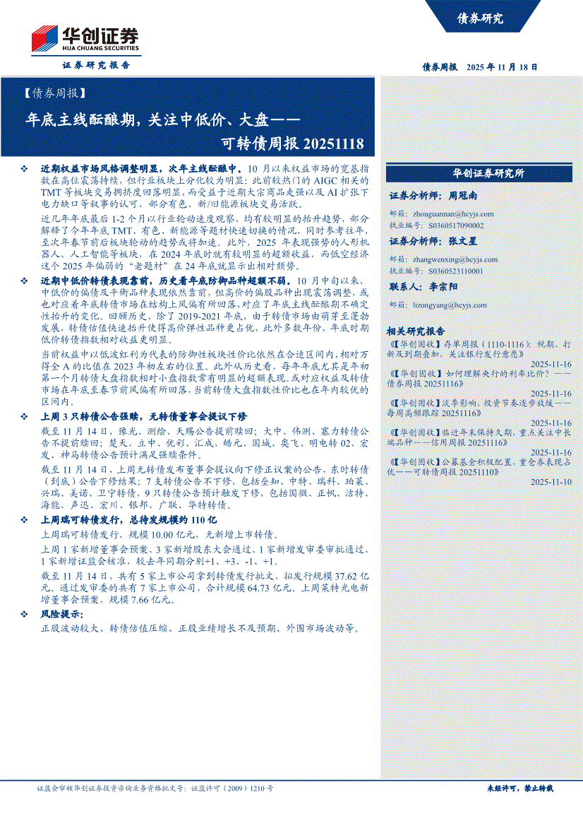 华创证券-【债券周报】可转债周报:年底主线酝酿期,关注中低价、大盘-251118