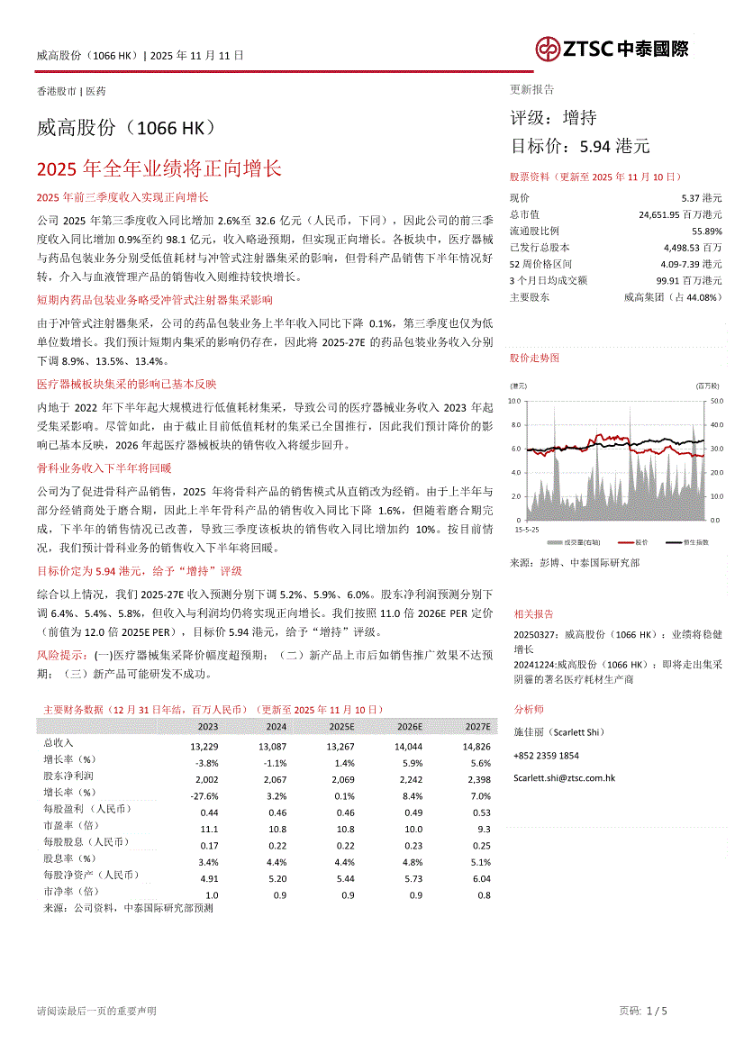 威高股份:中泰国际-威高股份-1066.HK-2025年全年业绩将正向增长-251111