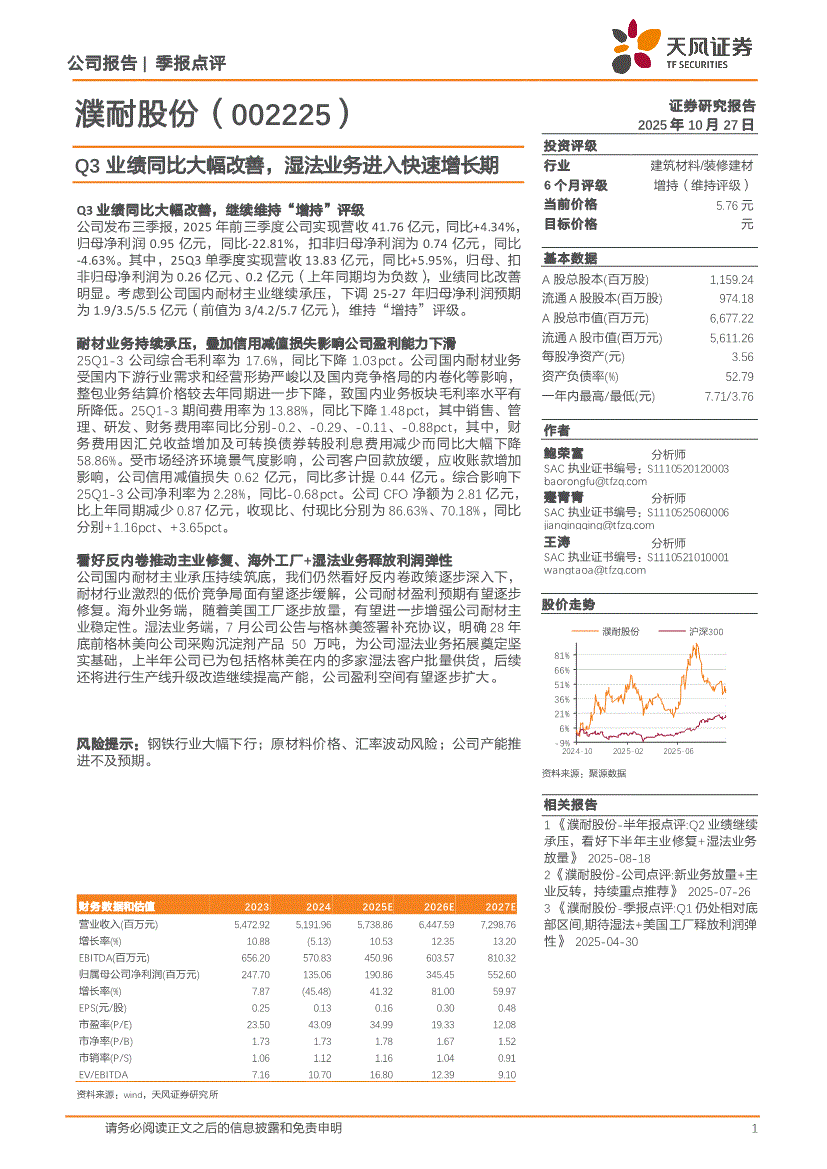 濮耐股份:天风证券-濮耐股份-002225-Q3业绩同比大幅改善,湿法业务进入快速增长期-251027