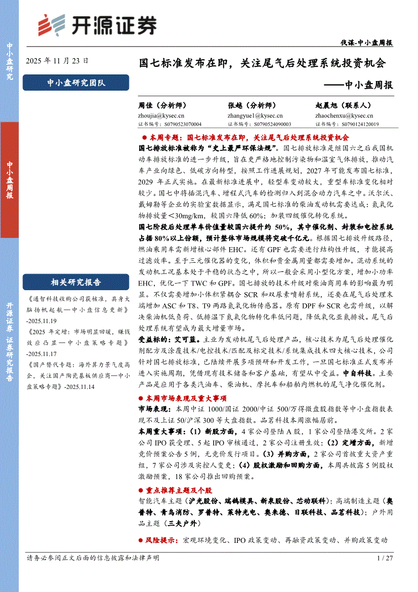 开源证券-中小盘周报:国七标准发布在即,关注尾气后处理系统投资机会-251123