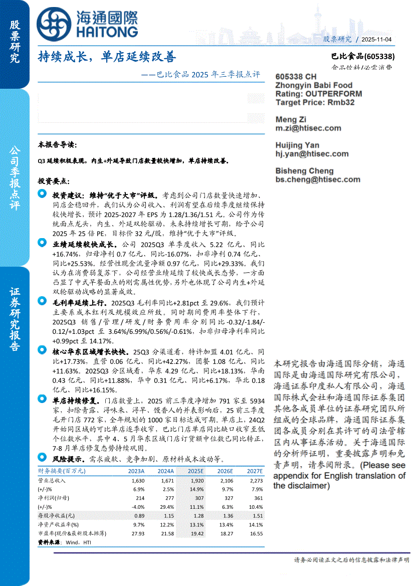 巴比食品:海通国际-巴比食品-605338-2025年三季报点评:持续成长,单店延续改善-251104