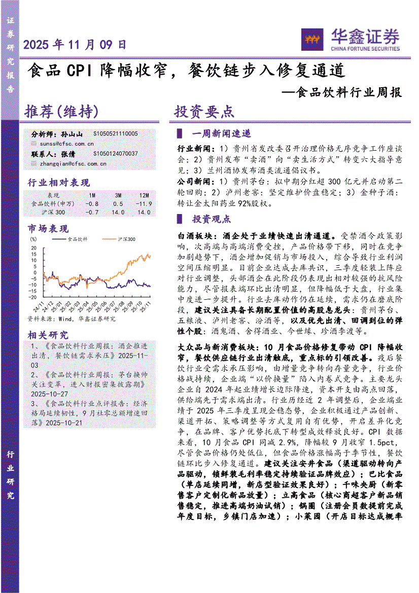 食品饮料行业:华鑫证券-食品饮料行业周报:食品CPI降幅收窄,餐饮链步入修复通道-251109