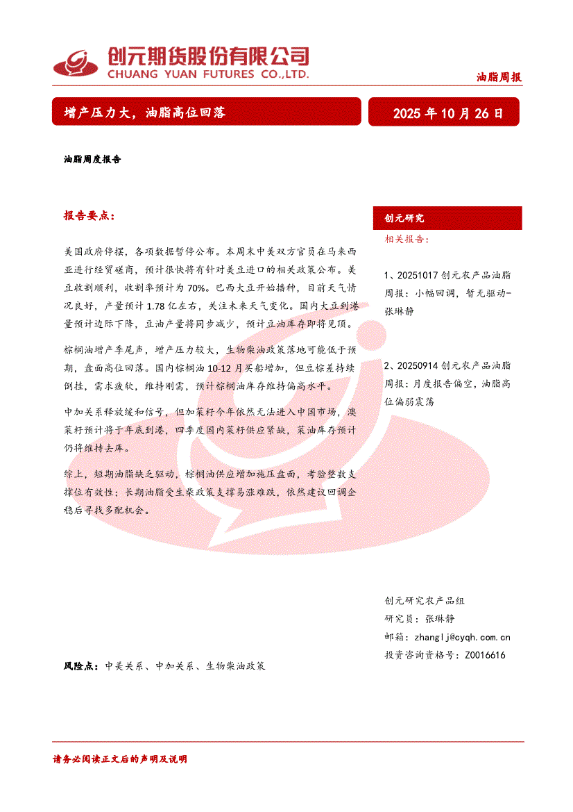 创元期货-油脂周度报告:增产压力大,油脂高位回落-251026
