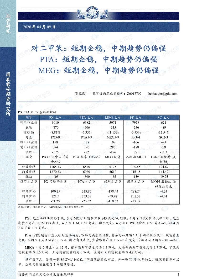 国泰君安期货-对二甲苯:短期企稳,中期趋势仍偏强,PTA,短期企稳,中期趋势仍偏强,MEG,短期企稳,中期趋势仍偏强-260409