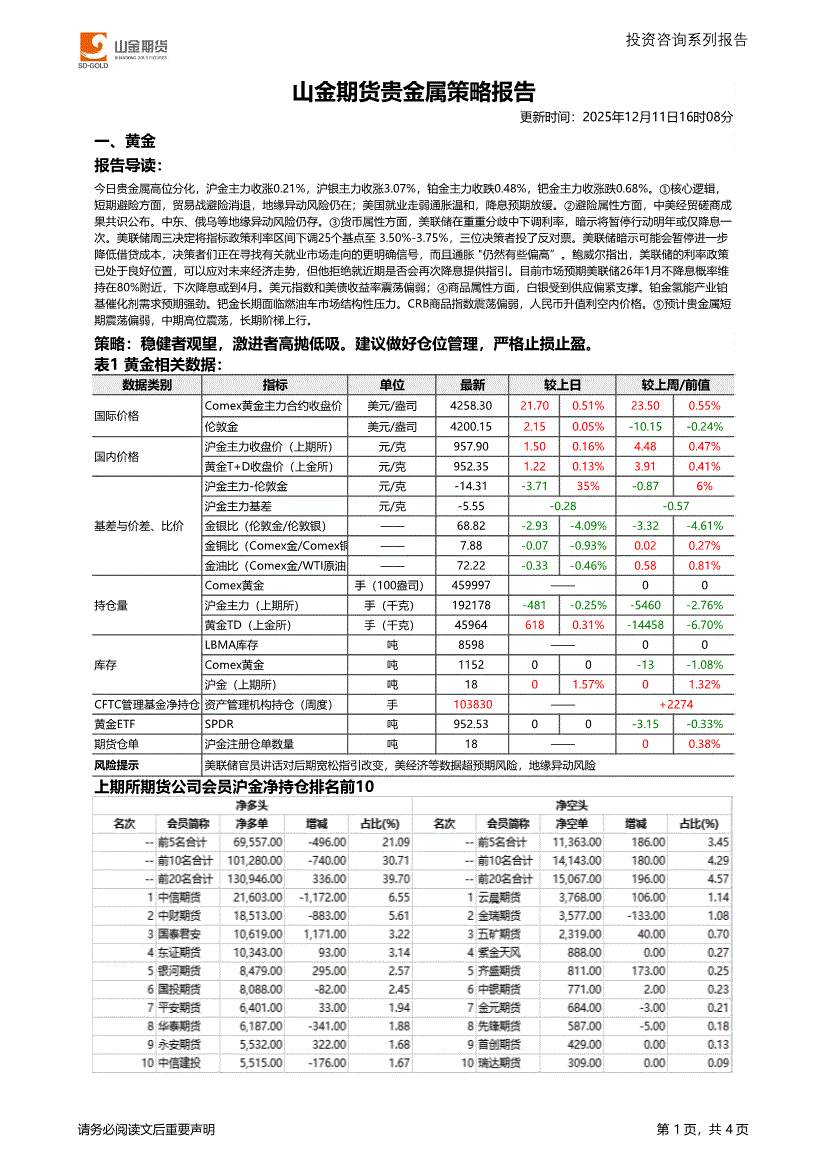 山金期货-贵金属月度策略报告:12月降息预期持续发酵,金银铂钯高位分化-251202