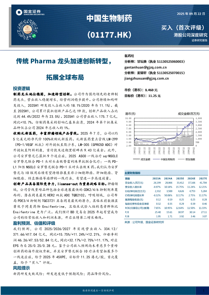 中国生物制药:国金证券-中国生物制药-1177.HK-传统Pharma龙头加速创新转型,拓展全球布局-250922