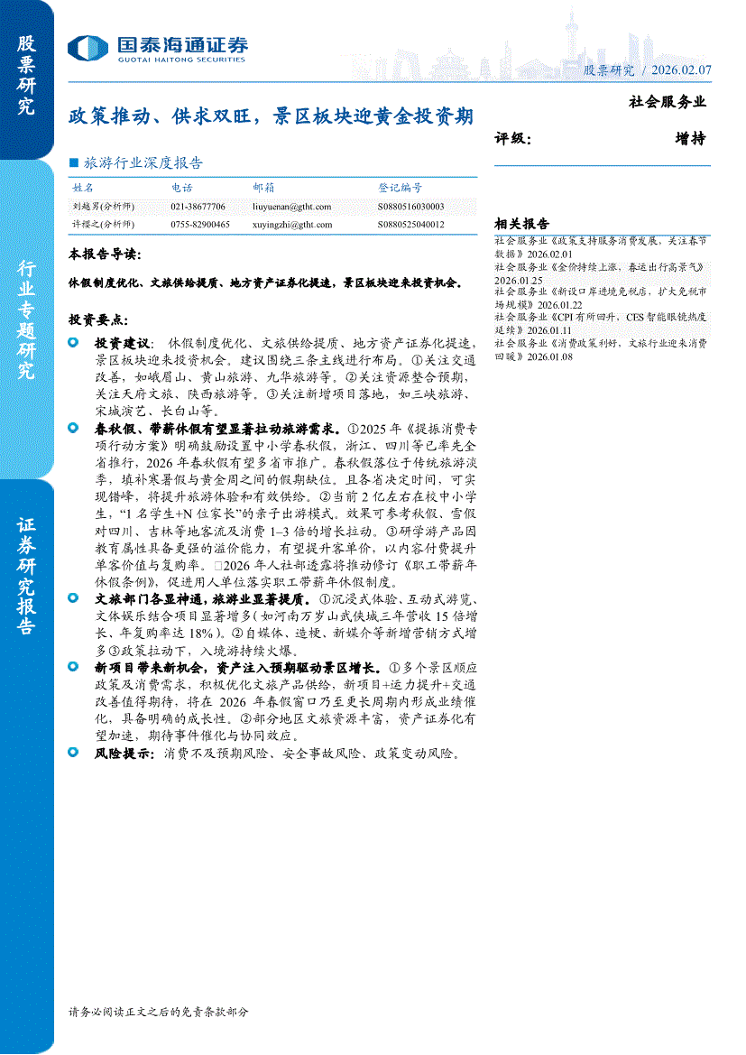 旅游行业:国泰海通证券-旅游行业深度报告:政策推动、供求双旺,景区板块迎黄金投资期-260207
