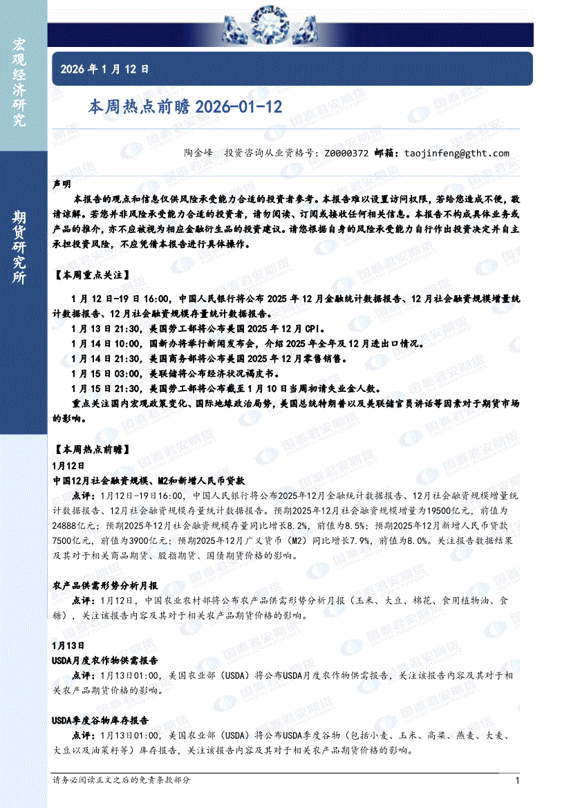 国泰君安期货-股指期货将偏强震荡,白银、铂、锡、焦煤、PTA期货将震荡偏强,黄金、铜期货将偏强震荡,PVC期货将震荡偏弱-260112