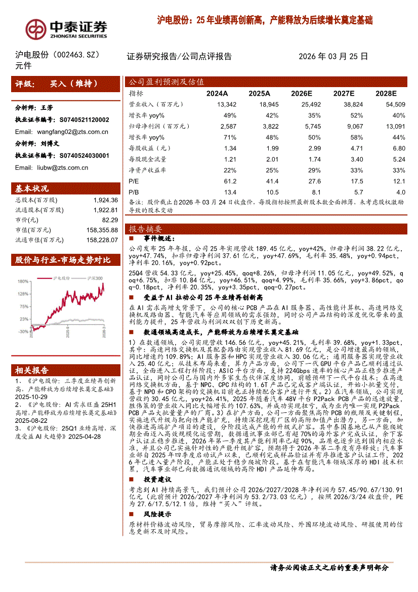 沪电股份:中泰证券-沪电股份-002463-25年业绩再创新高,产能释放为后续增长奠定基础-260325