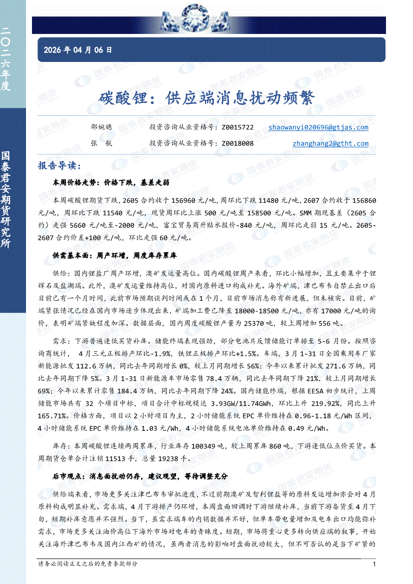 国泰君安期货-碳酸锂:供应端消息扰动频繁-260406