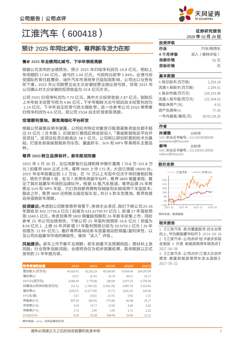 江淮汽车:天风证券-江淮汽车-600418-预计2025年同比减亏,尊界新车发力在即-260226