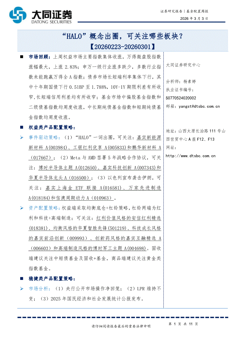 大同证券-基金配置周报:“HALO”概念出圈,可关注哪些板块?-260303