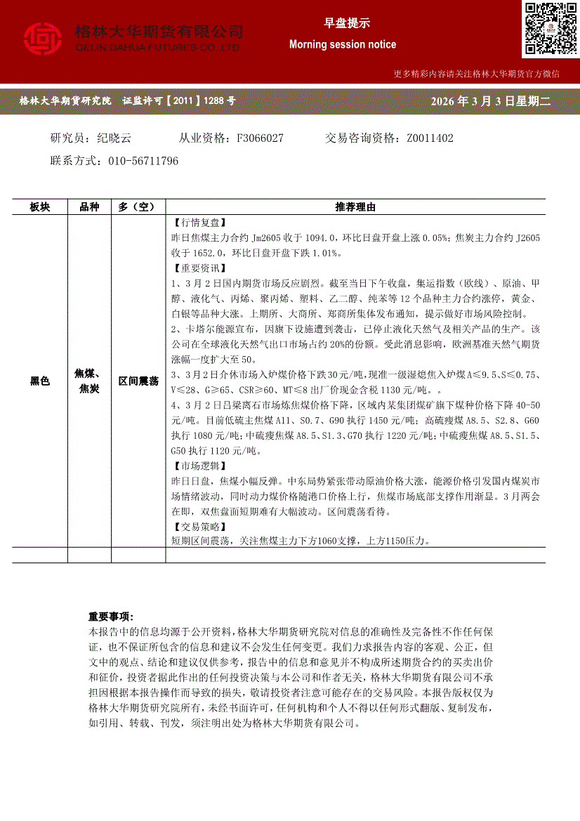 格林大华期货-早盘提示:双焦-260303