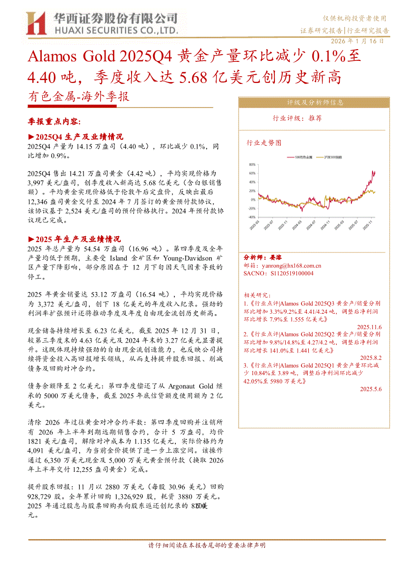 有色金属行业:华西证券-有色金属行业~海外季报:Alamos Gold 2025Q4黄金产量环比减少0.1%至4.40吨,季度收入达5.68亿美元创历史新高-260116