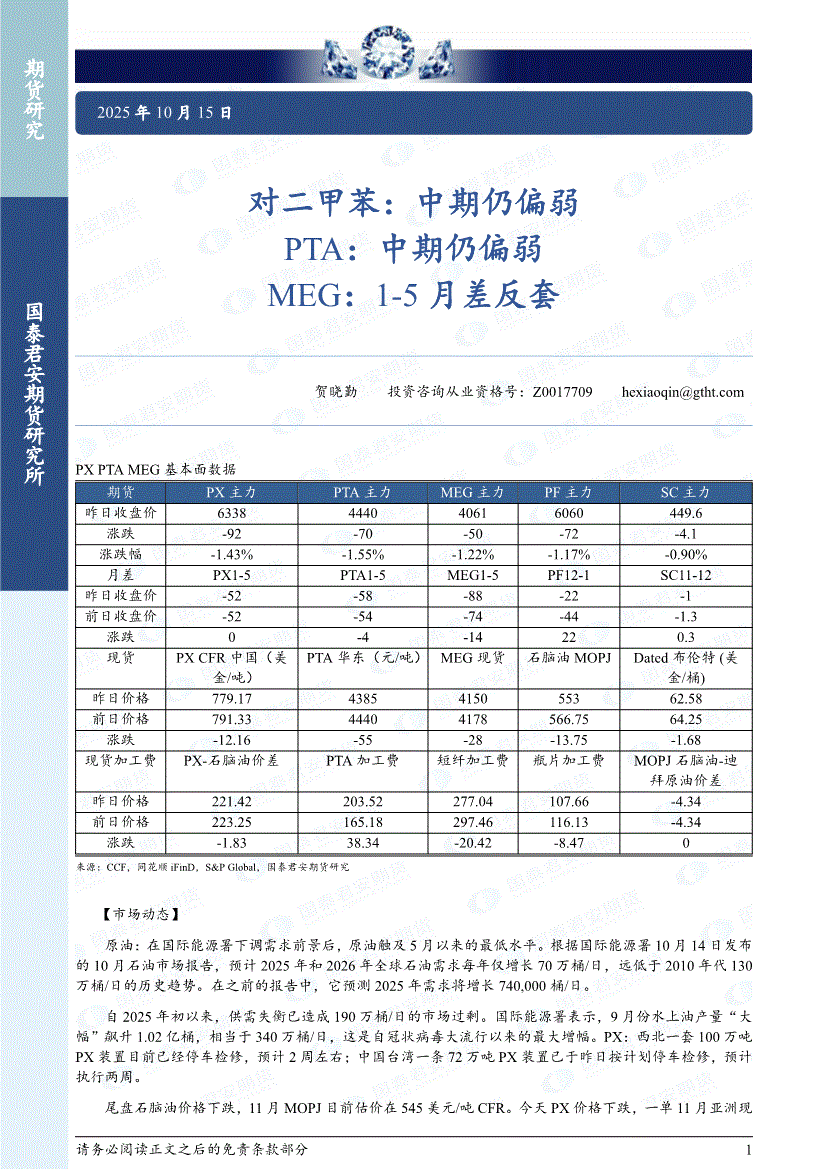 国泰君安期货-对二甲苯:中期仍偏弱,PTA,中期仍偏弱,MEG,1~5月差反套-251015