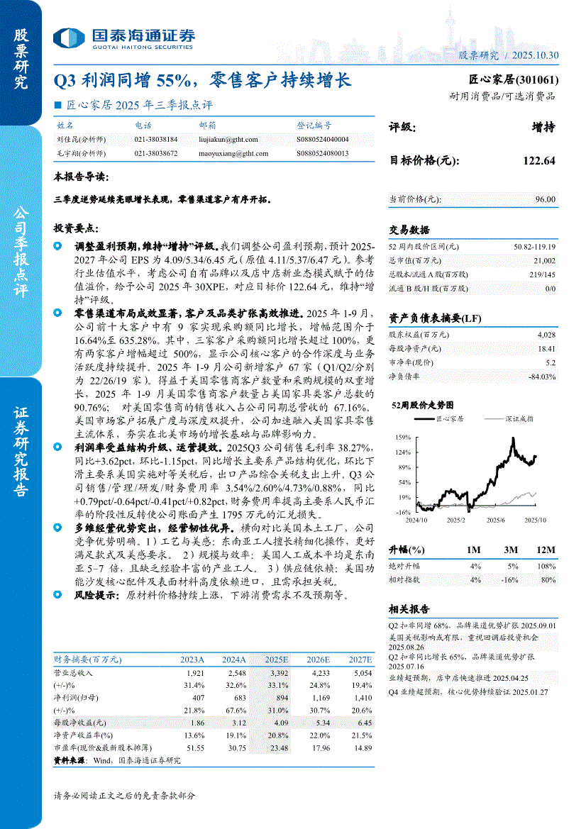 匠心家居:国泰海通证券-匠心家居-301061-2025年三季报点评:Q3利润同增55%,零售客户持续增长-251030