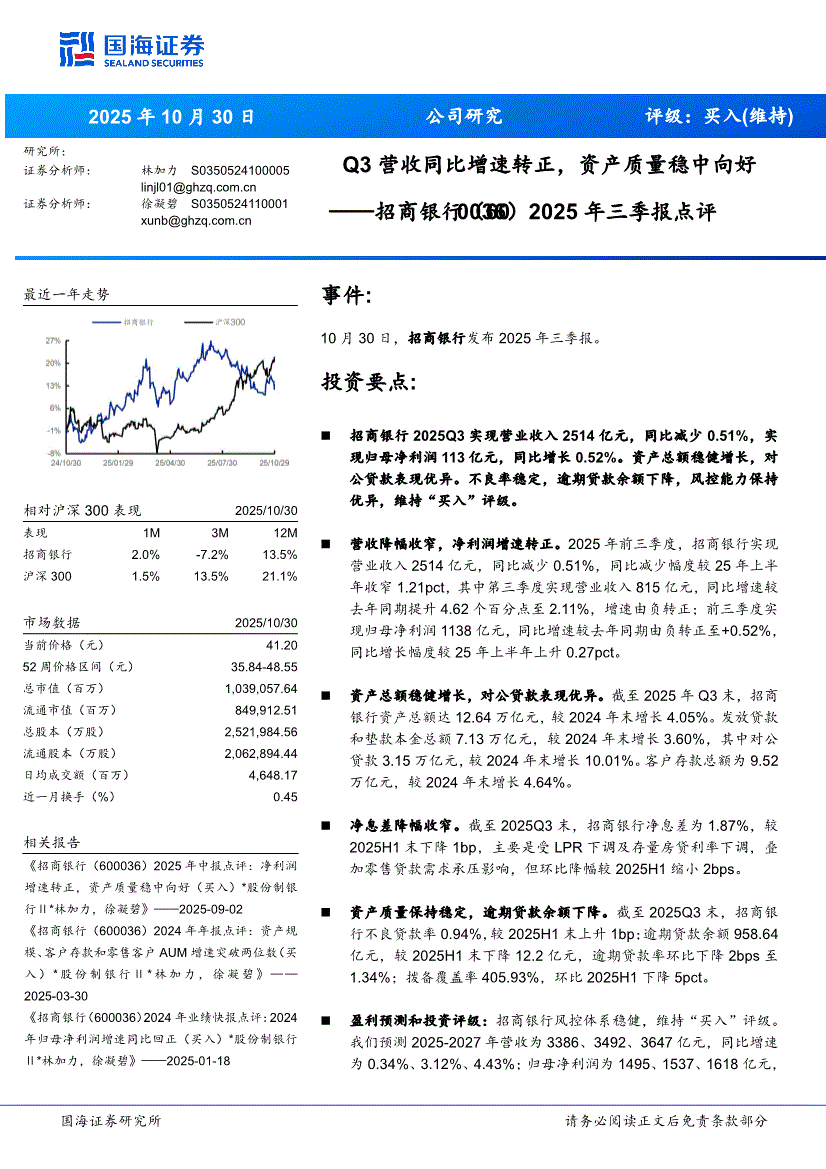 招商银行:国海证券-招商银行-600036-2025年三季报点评:Q3营收同比增速转正,资产质量稳中向好-251030