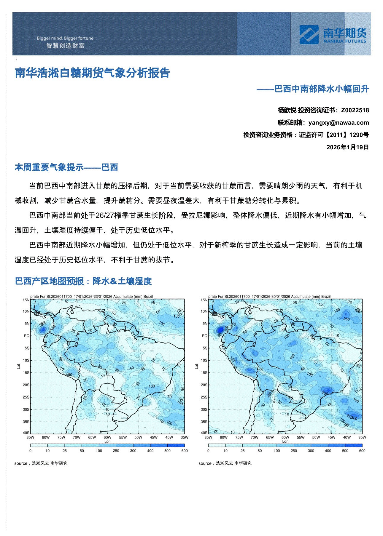 南华期货-浩淞白糖期货气象分析报告:巴西中南部降水小幅回升-260119