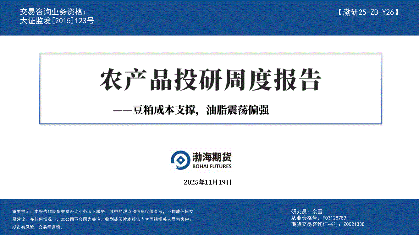 渤海期货-农产品投研周度报告:豆粕成本支撑震荡,油脂震荡偏强-251119