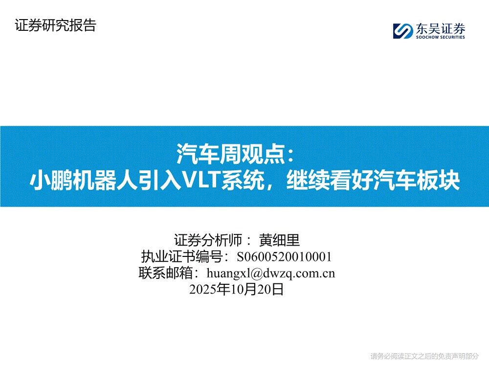 汽车行业:东吴证券-汽车行业周观点:小鹏机器人引入VLT系统,继续看好汽车板块-251020