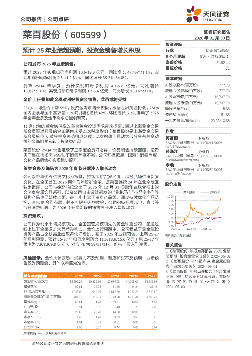 菜百股份:天风证券-菜百股份-605599-预计25年业绩超预期,投资金销售增长积极-260130