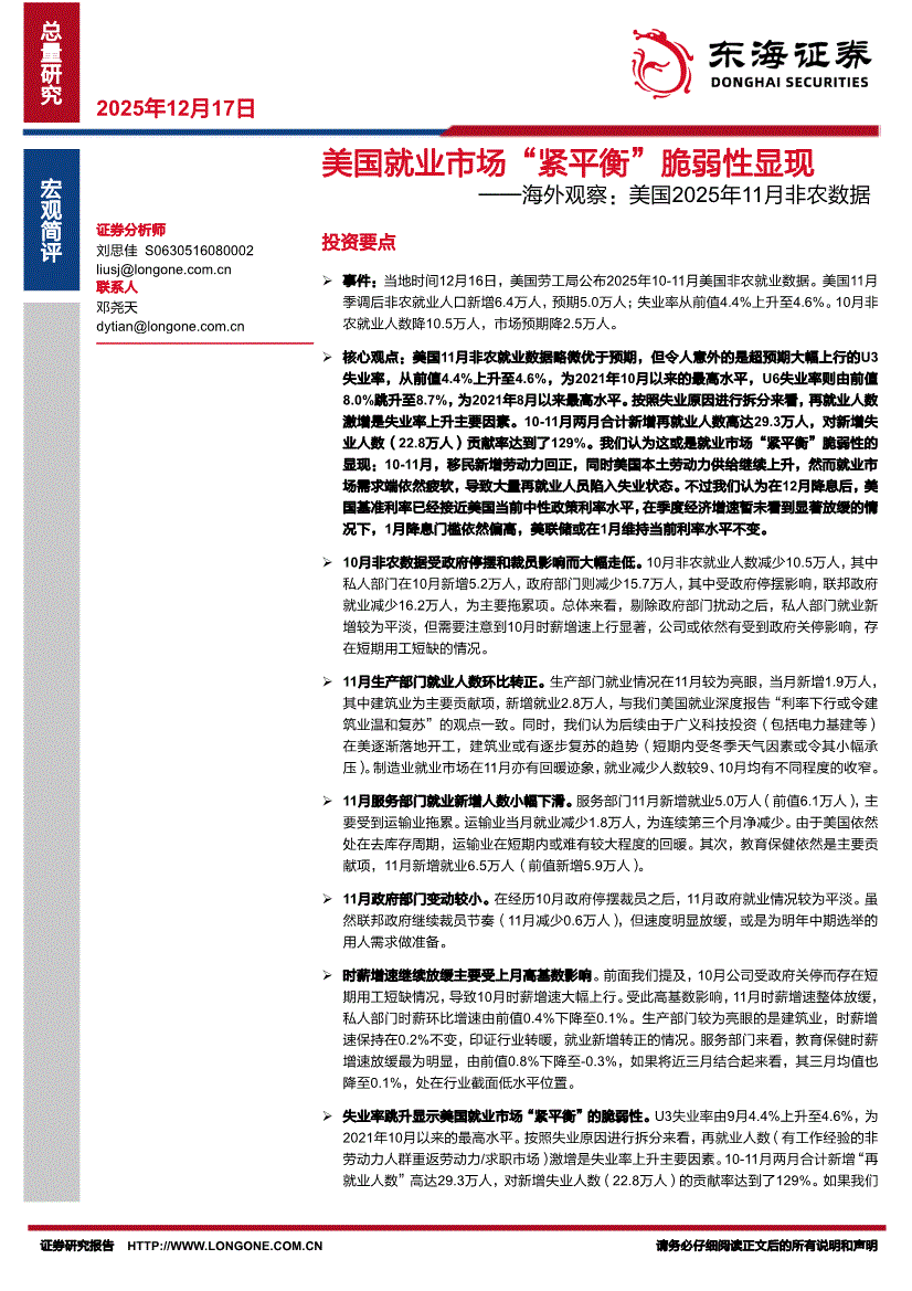东海证券-海外观察:美国2025年11月非农就业数据,美国就业市场“紧平衡”脆弱性显现-251217