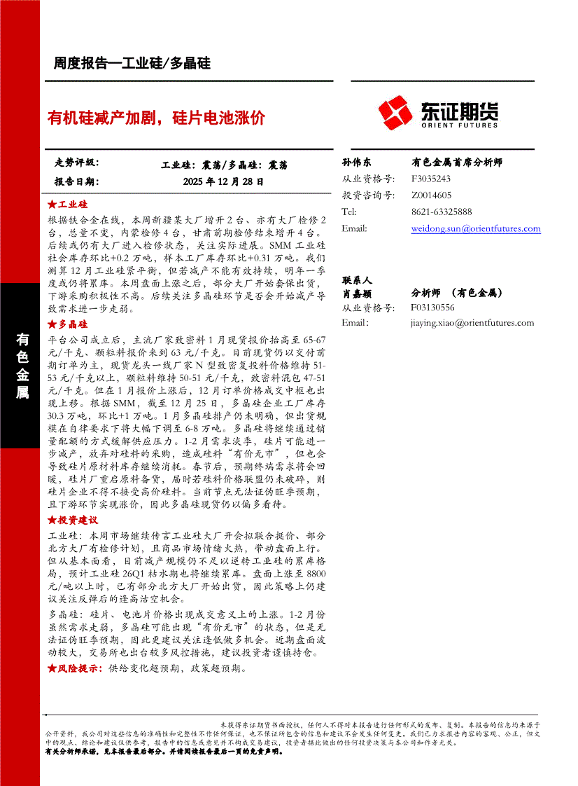 东证期货-工业硅/多晶硅周度报告:有机硅减产加剧,硅片电池涨价-251228