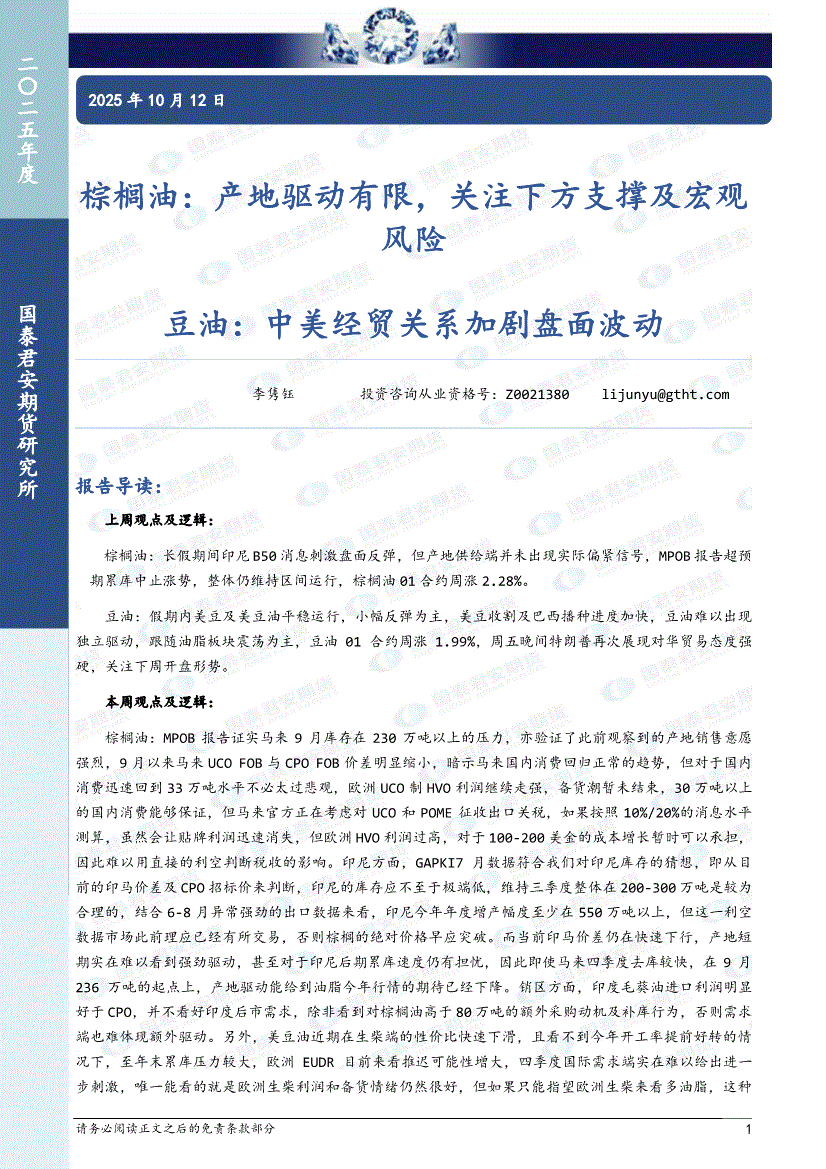 国泰君安期货-棕榈油:产地驱动有限,关注下方支撑及宏观风险,豆油,中美经贸关系加剧盘面波动-251012
