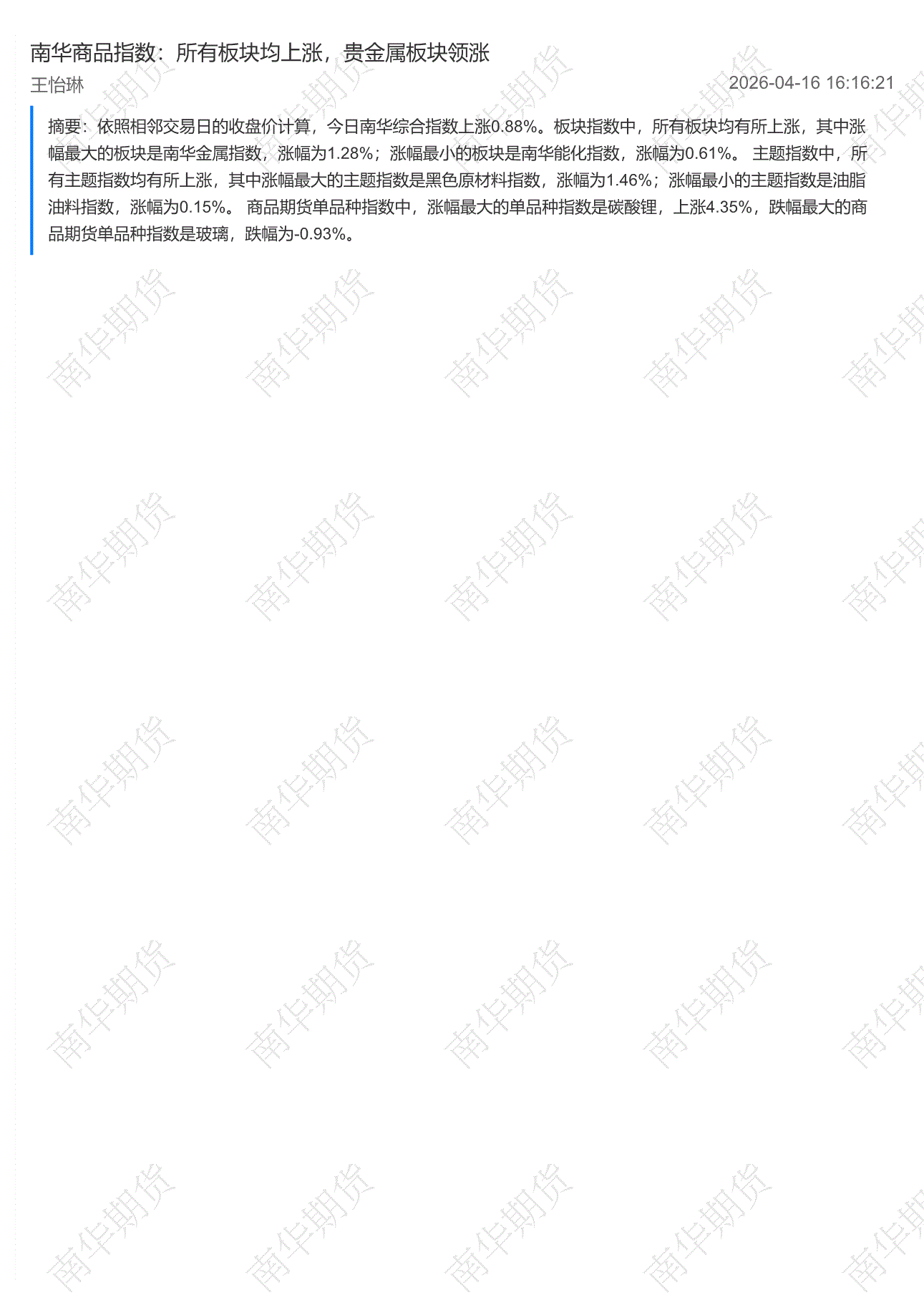 南华期货-南华商品指数:所有板块均上涨,贵金属板块领涨-260416