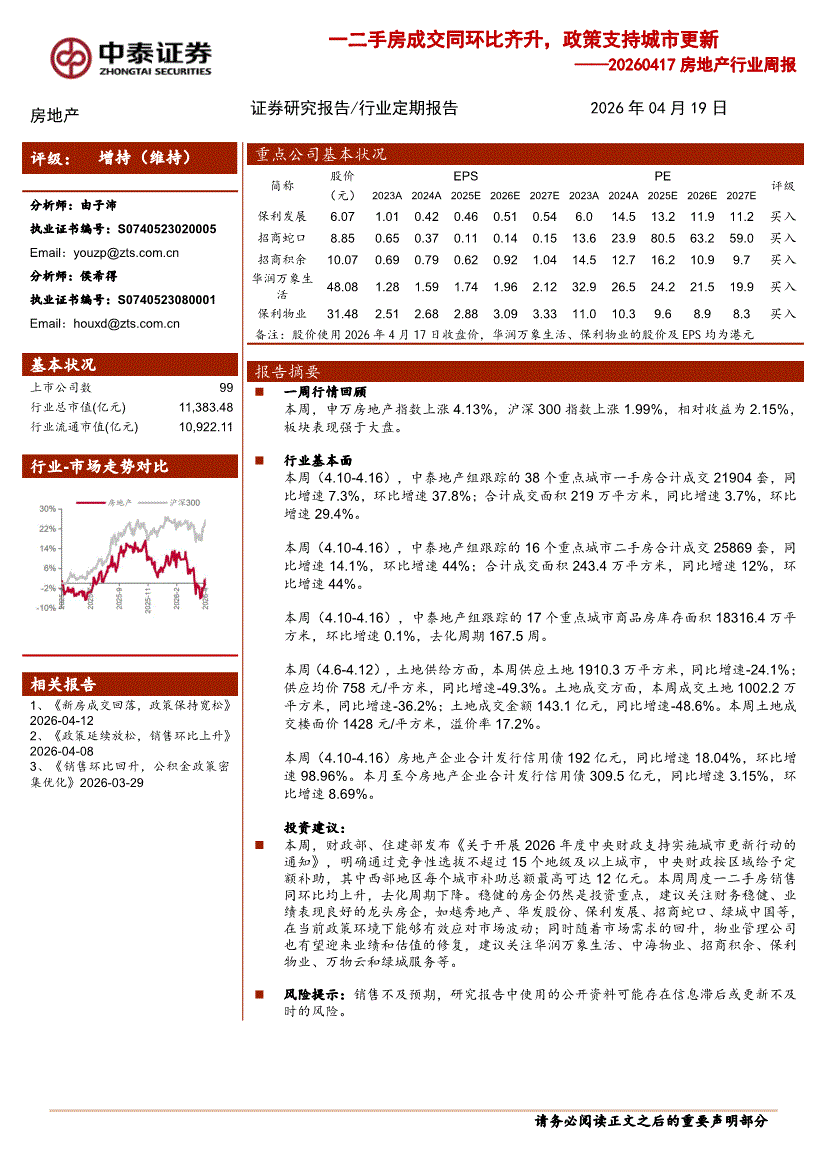 房地产行业:中泰证券-房地产行业周报:一二手房成交同环比齐升,政策支持城市更新-260419