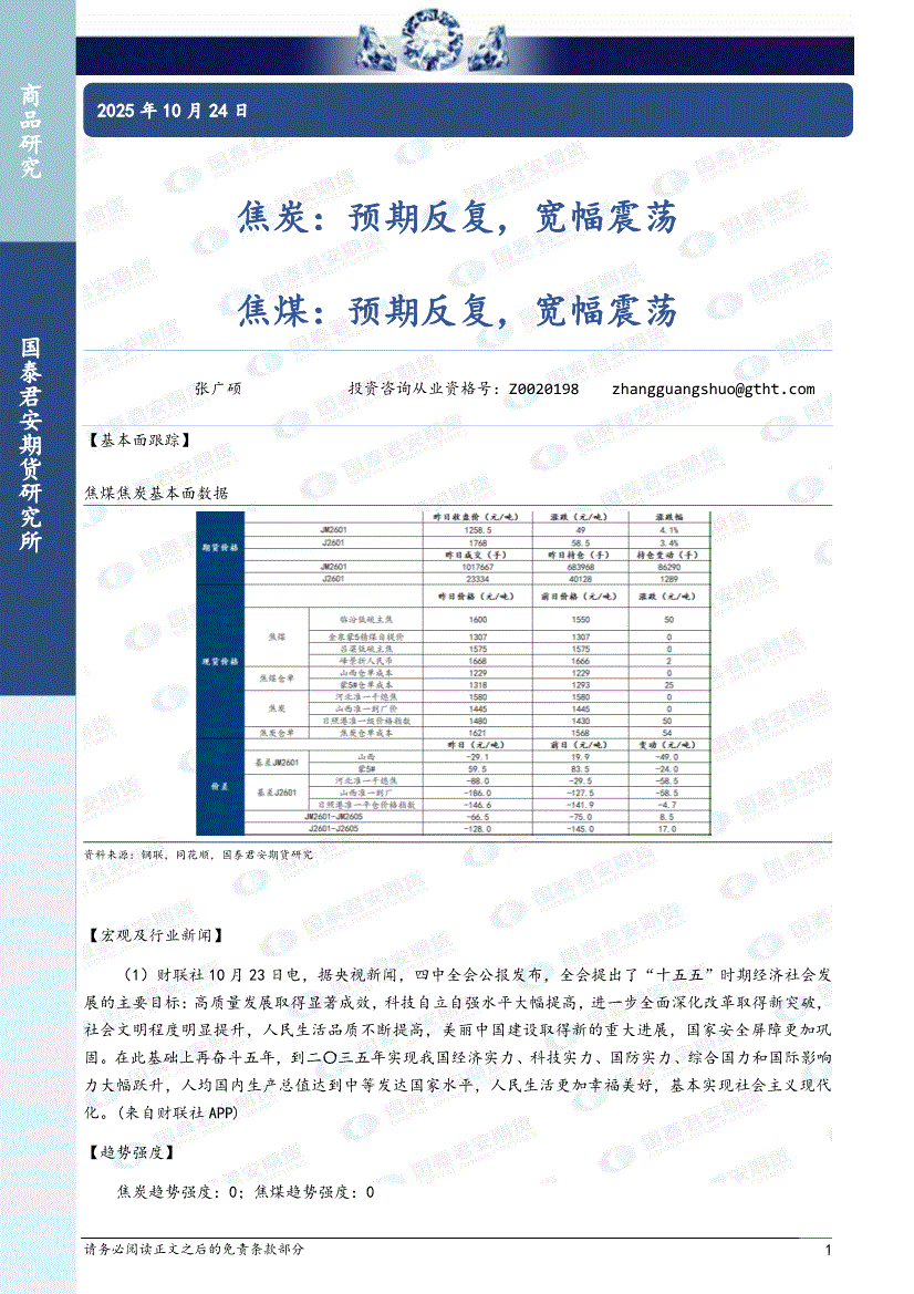 国泰君安期货-焦炭:预期反复,宽幅震荡,焦煤,预期反复,宽幅震荡-251024