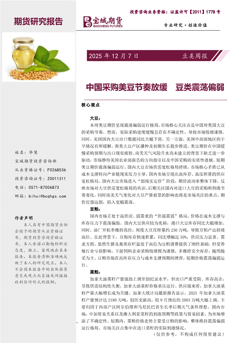 宝城期货-豆类周报:中国采购美豆节奏放缓,豆类震荡偏弱-251207