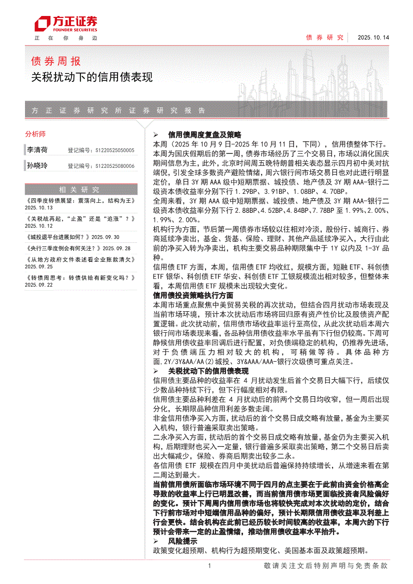 方正证券-债券周报:关税扰动下的信用债表现-251014