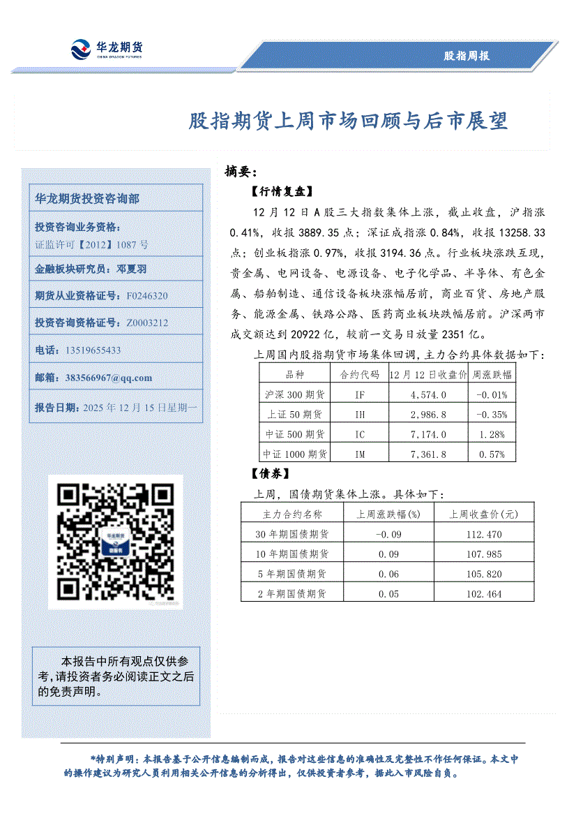 华龙期货-股指周报:股指期货上周市场回顾与后市展望-251215
