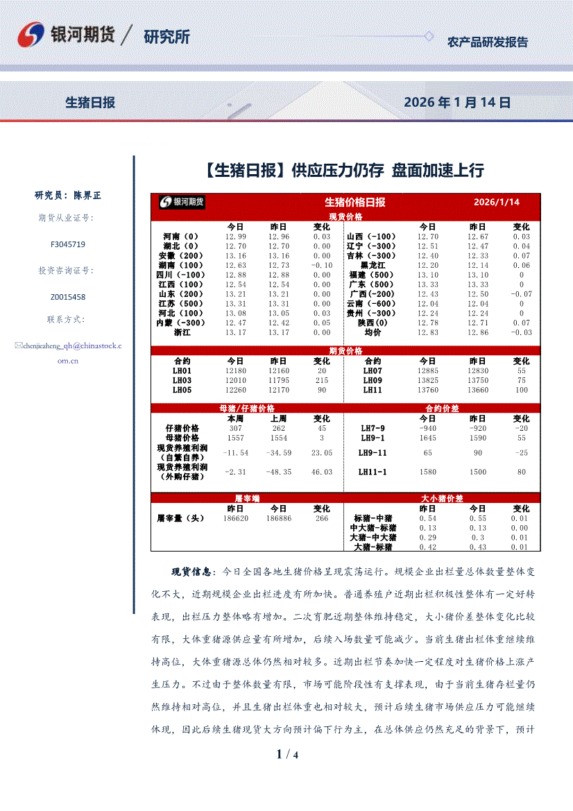 银河期货-【生猪日报】供应压力仍存,盘面加速上行-260114