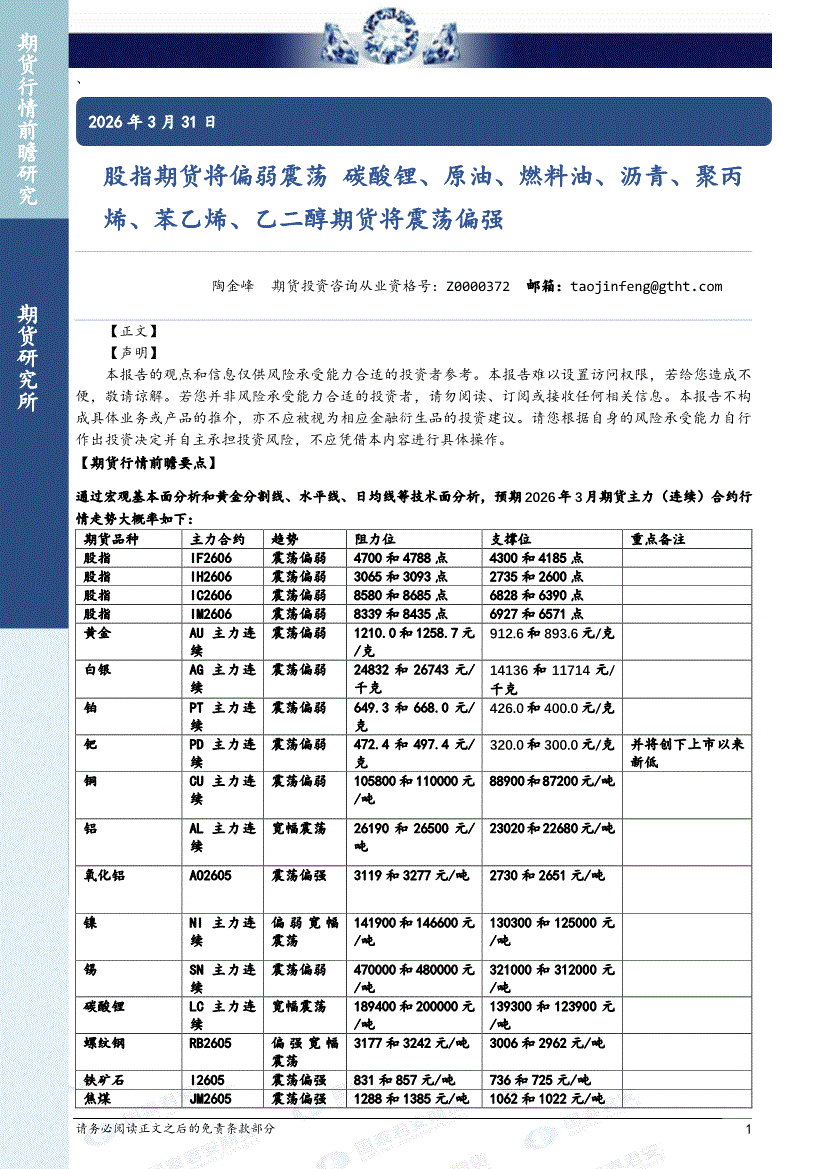 国泰君安期货-股指期货将偏弱震荡,铝、碳酸锂、原油、燃料油、沥青、聚丙烯、苯乙烯、对二甲苯、甲醇、乙二醇期货将震荡偏强,白银、铂、钯期货将震荡偏弱-260330