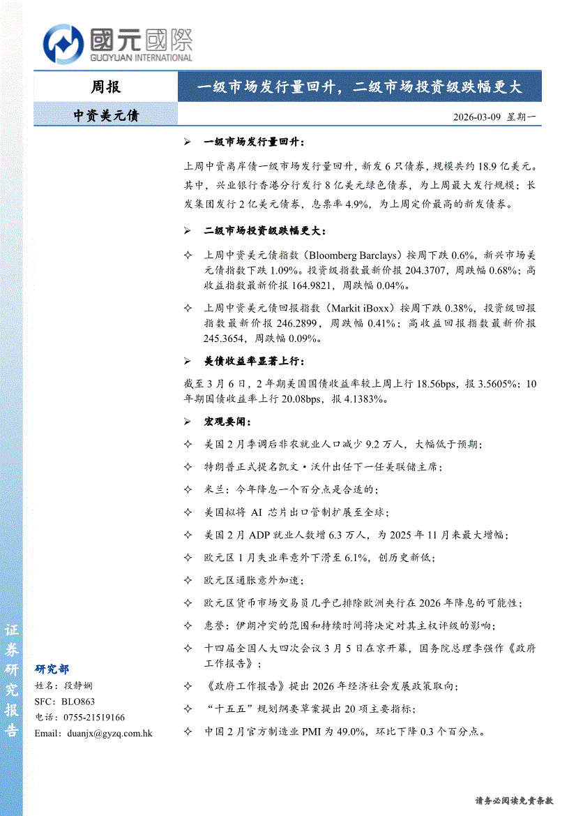 国元国际-中资美元债周报:一级市场发行量回升,二级市场投资级跌幅更大-260309