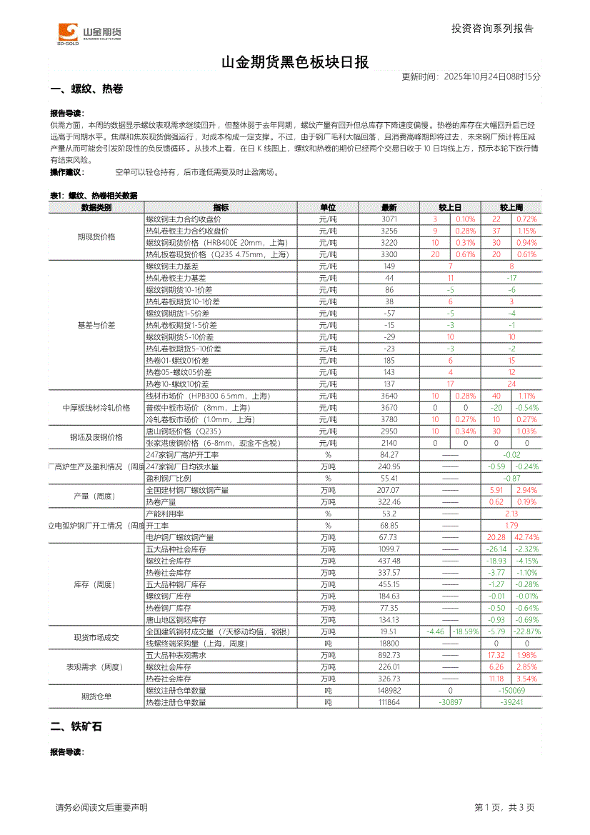 山金期货-螺纹热卷2025年四季报:当前供需同步转弱压力仍在,期价中期仍有望探底回升-251014