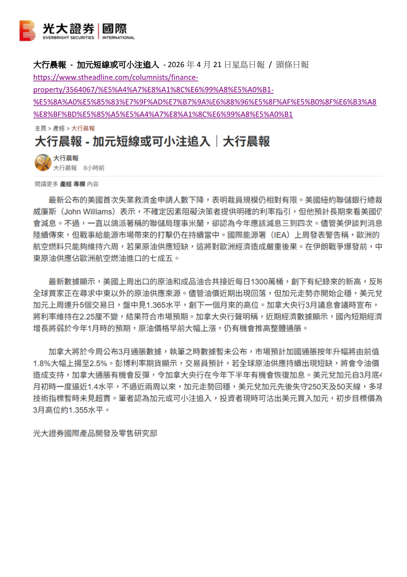 光大证券(国际)-大行晨报:加元短线或可小注追入-260421