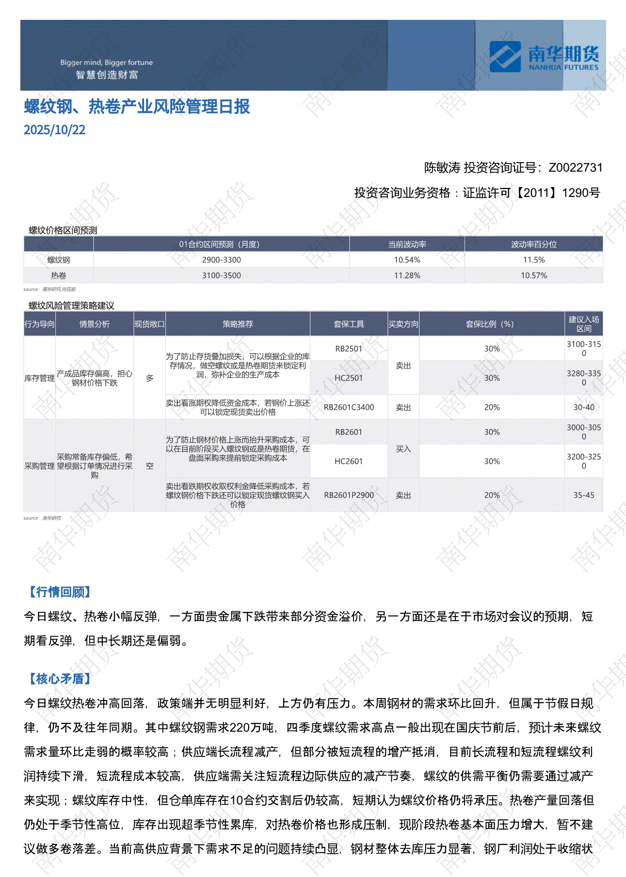 南华期货-螺纹钢、热卷产业风险管理日报-251022
