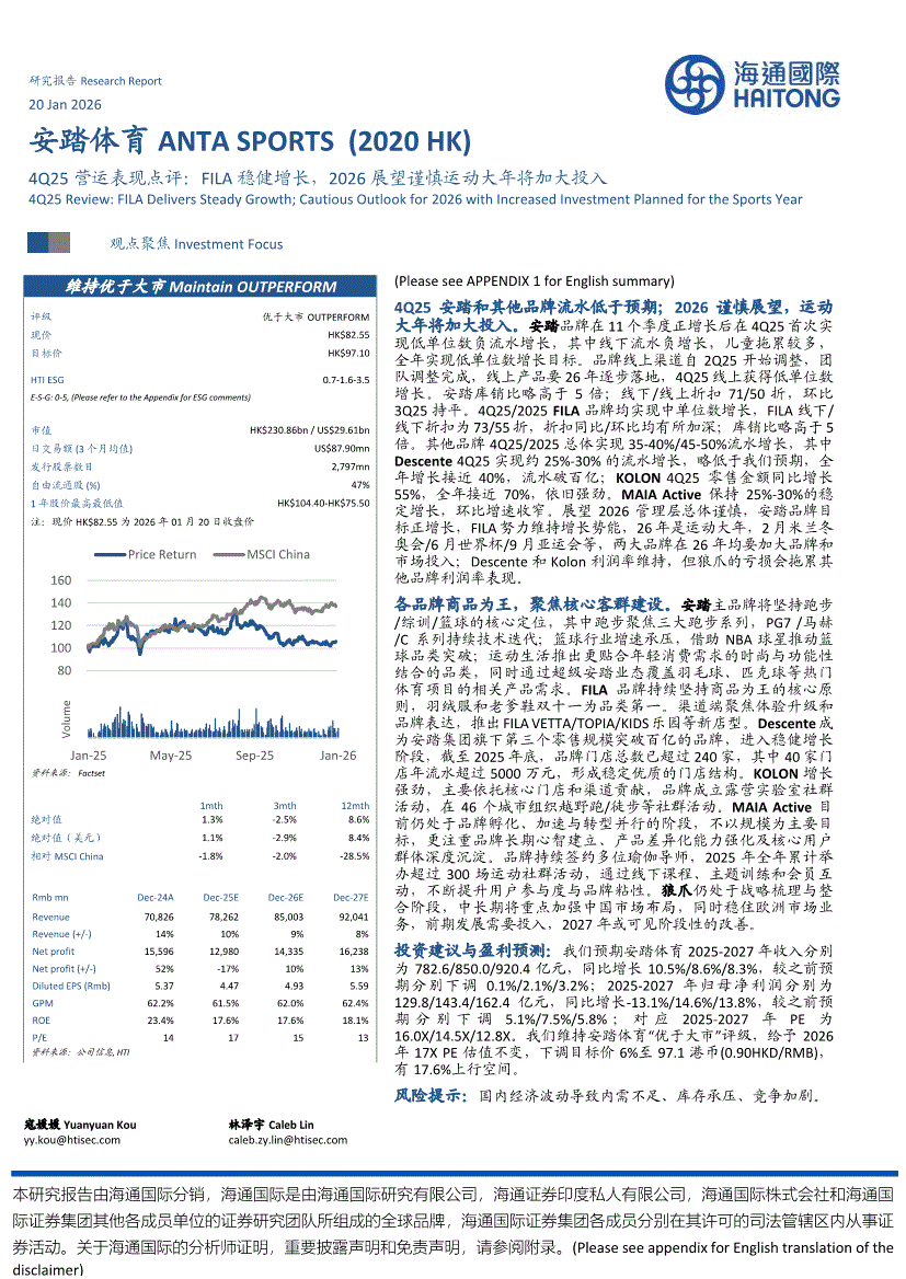 安踏体育:海通国际-安踏体育-2020.HK-4Q25营运表现点评:FILA稳健增长,2026展望谨慎运动大年将加大投入-260120