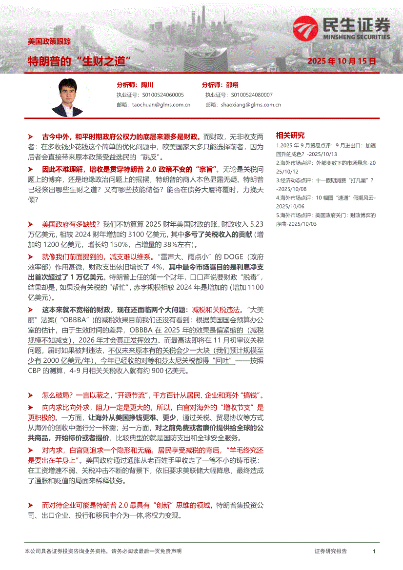 民生证券-美国政策跟踪:特朗普的“生财之道”-251015