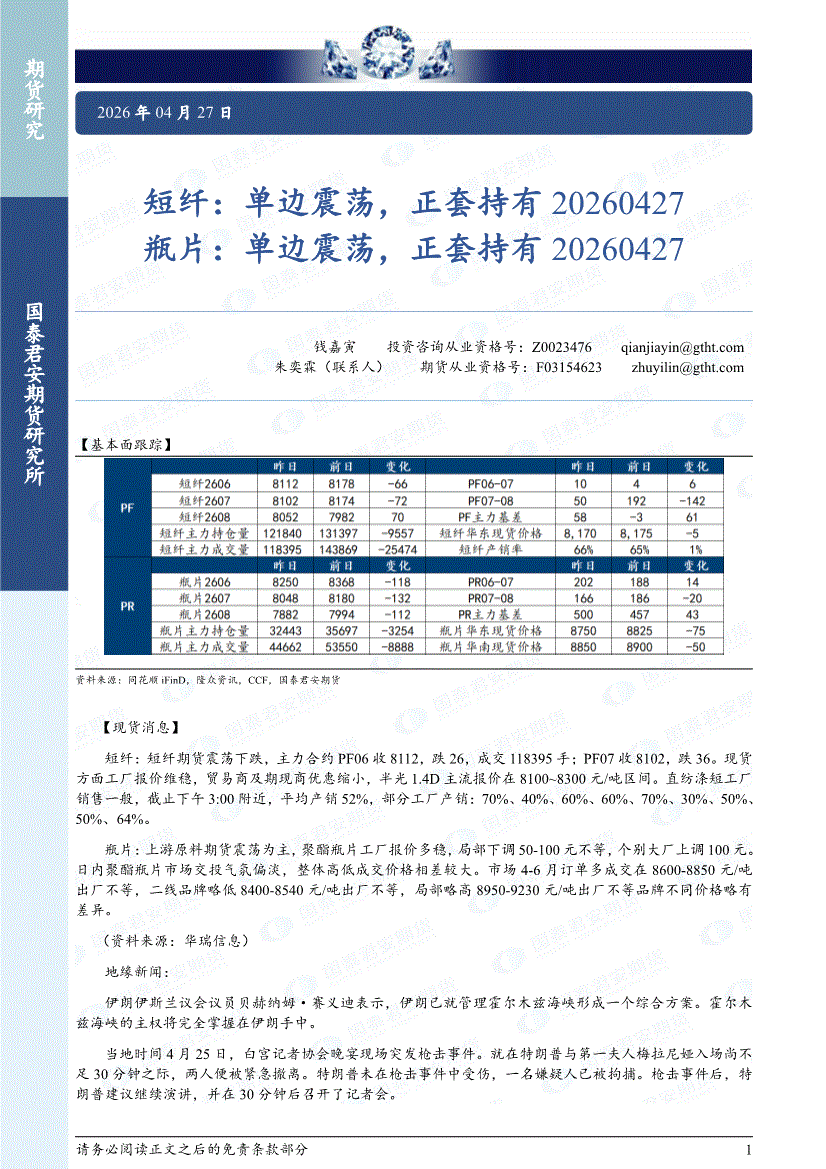 国泰君安期货-短纤:单边震荡,正套持有,瓶片,单边震荡,正套持有-260427