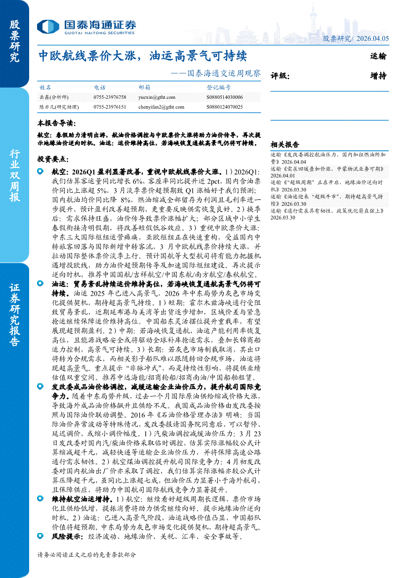 运输行业:国泰海通证券-交运行业周观察:中欧航线票价大涨,油运高景气可持续-260405