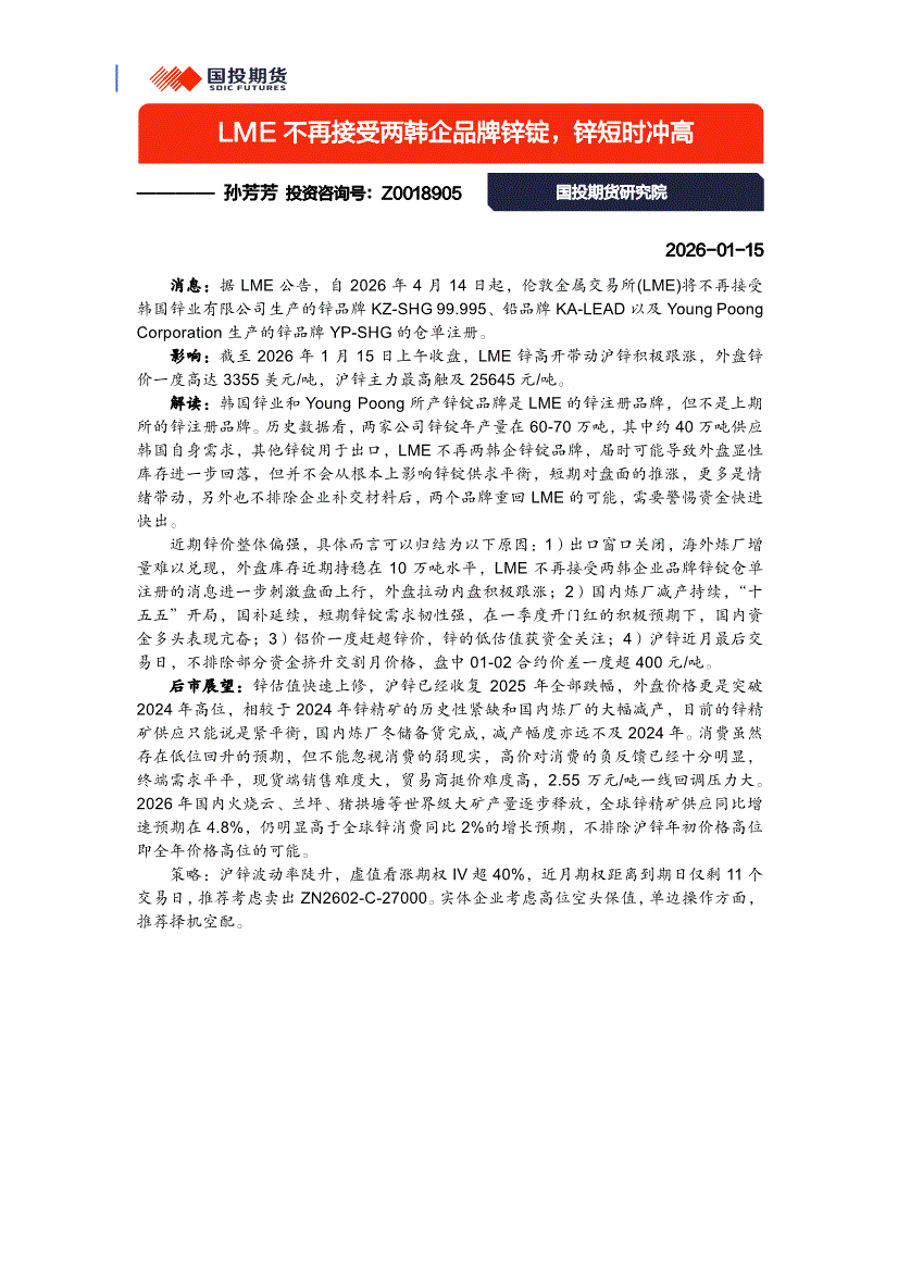 国投期货-LME不再接受两韩企业品牌锌锭,锌短时冲高-260115