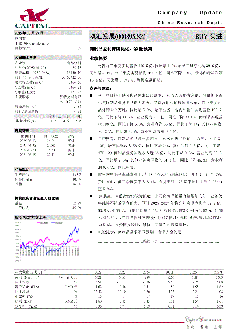 双汇发展:群益证券-双汇发展-000895-肉制品盈利持续优化,Q3超预期-251029