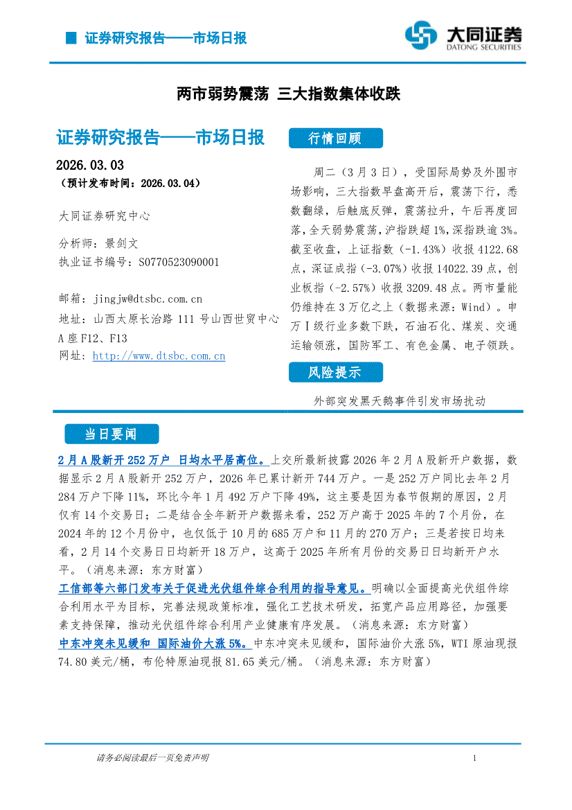 大同证券-市场日报:两市弱势震荡,三大指数集体收跌-260303