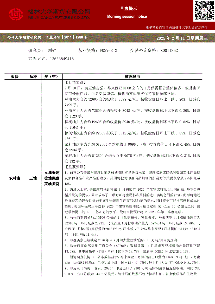 格林大华期货-期货周报:春节在即,油粕前期多单逐步减仓,节后再战-260207
